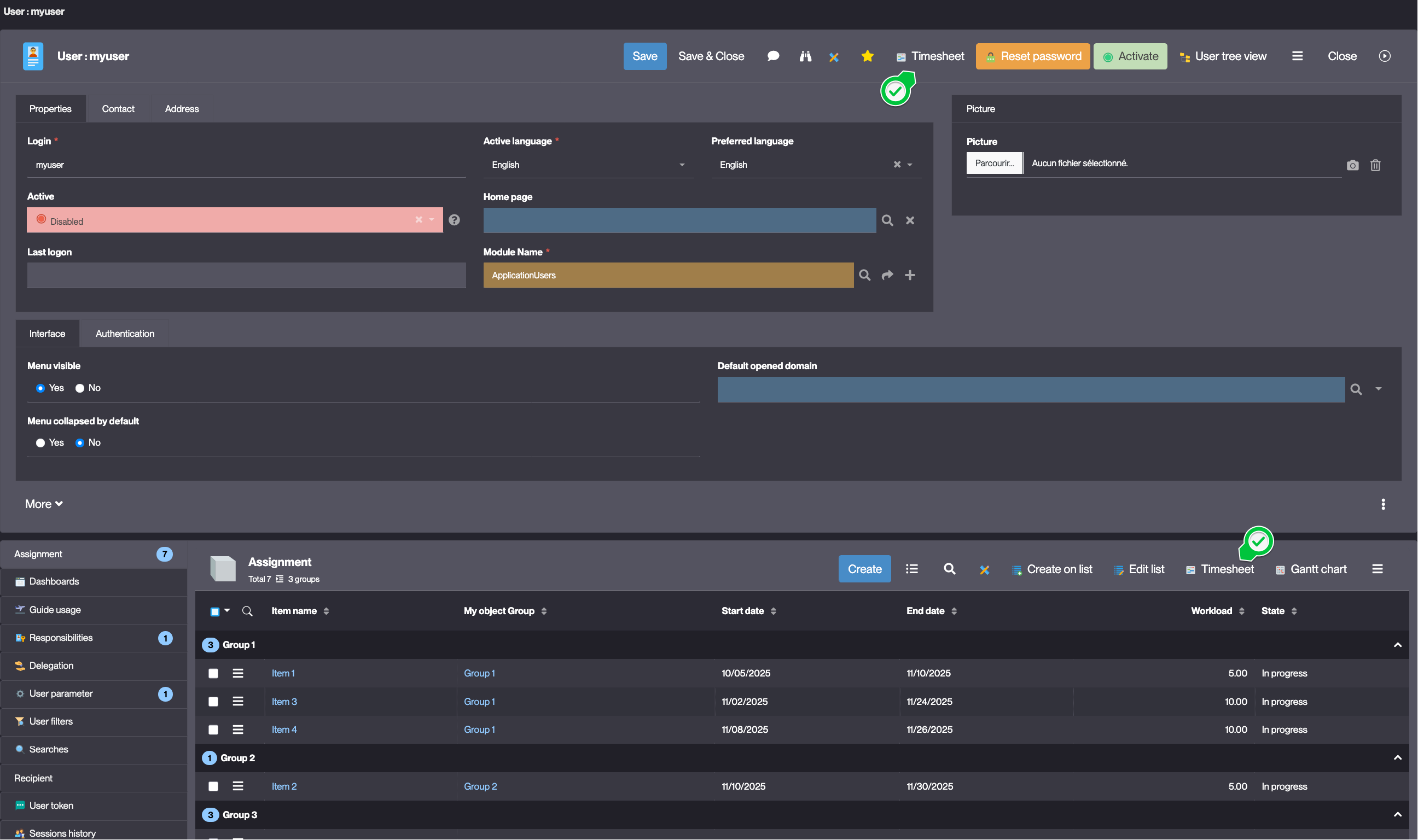 | Use Gantt diagram | Display a Gantt diagram linked to the timesheet |