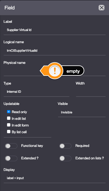- In the Object Fields panel linked to the Business object, open trnCliSupplierVirtualId