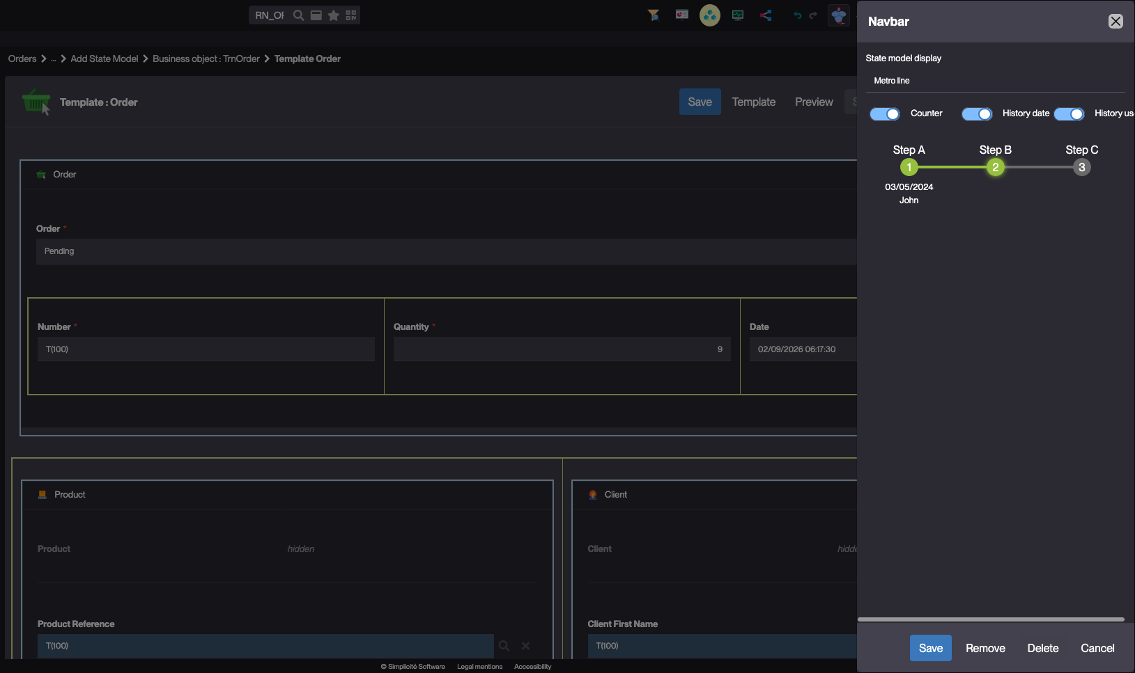 On the "TrnOrder" Business object's form, click + Add > States navbar